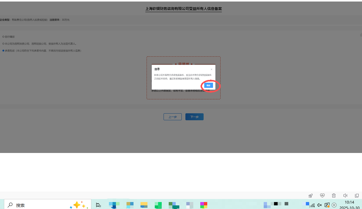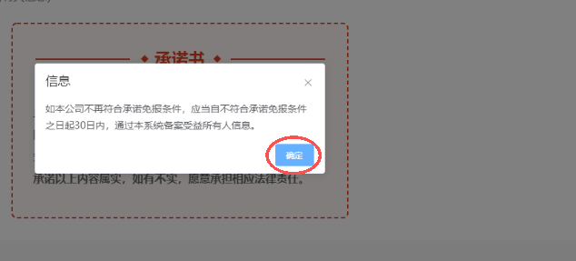 在点击【承诺免报】-【下一步】后出现图1的信息框,点击信息框红圈标注的【确定】后,回到了下图2,即表示申报成功。
